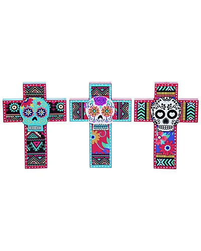- This beautiful piece from Transpac’s Day of the Dead collection is sure to bring some added flair to your Halloween season! Made of wood, these dimensional cross set of 3 are the perfect addition to your home assortment – or a gift for those who matter the most!
